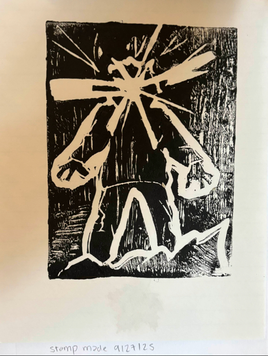 8/8/25: hi hello everyone i am so very late with posting my july art oopsie! i moved like four states away from where i was previously living on the 2nd, so i've been really busy unpacking and doing important things like getting groceries and moving furniture. that's largely done now, it's just a matter of the little things. without further ado, here are the things i made in july 2025, mediums include: block printing, crayons, colored pencils, pencils, and i think that's it! hope you guys are doing good in the hellscape that is life :)